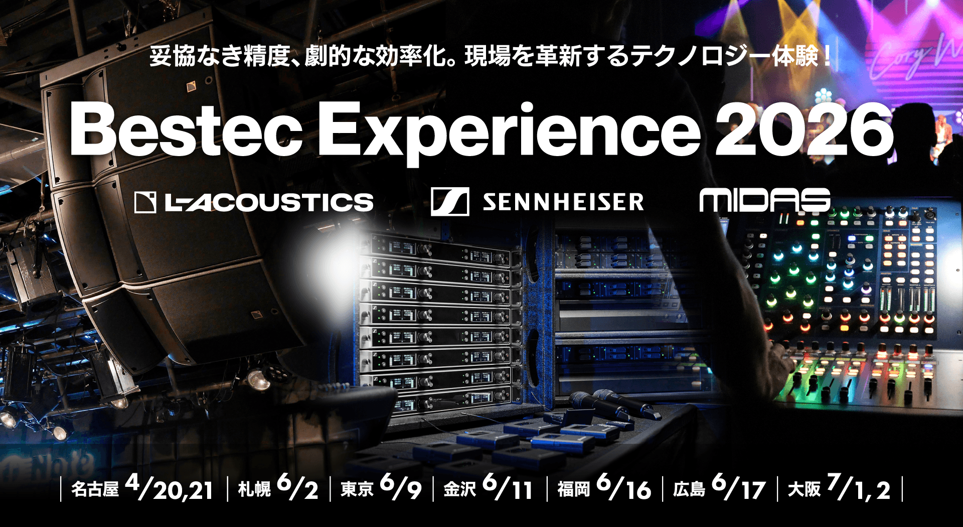 ベステックオーディオが主催する、全国7都市を巡るロードショー「Bestec Experience 2026」では、L-Acoustics Aシリーズ、1.2GHz帯対応のSennheiser EW-DX、Midas HD96シリーズが一堂に会します。