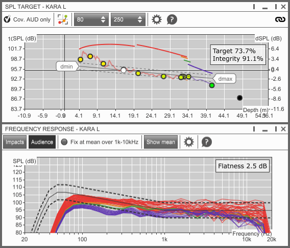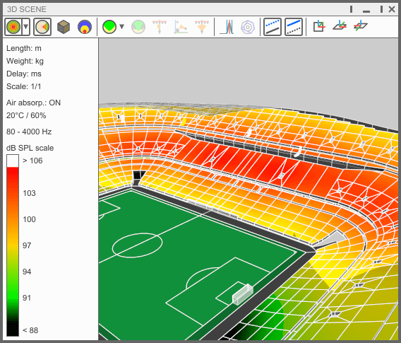 スピーカー配置やカバレッジゾーンを含む詳細な会場モデルにより、関係者が空間的な影響を視覚的に把握できます。 - 高解像度データ表示