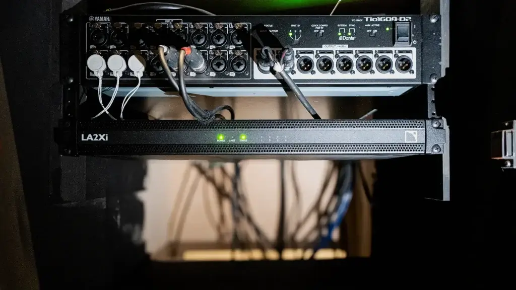 DJブース内。X8とKS21を駆動するLA2Xiが収められている。