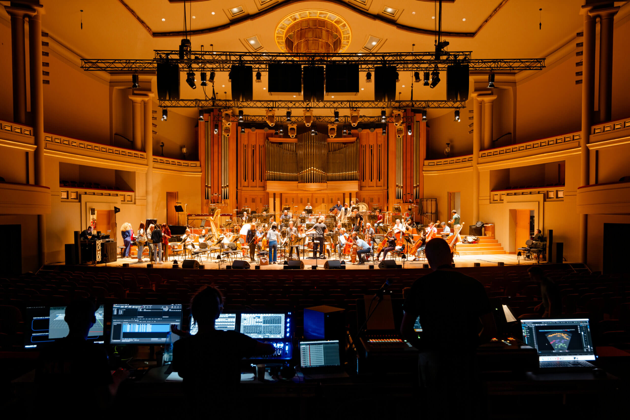 この技術的成果は、洗練されていると同時に極めて高い完成度を誇ります。チームはSoundvisionモデリング・ソフトウェアを用いて、曲線的な客席形状と複数のバルコニーを持つ客席全体について、すべての座席をカバーする音響設計を行いました。最終的な構成では、L2Dスピーカー5列を正確に配置したフライングシステムと、ホールの自然な音響特性を損なうことなく強力な低音を再生する4台のKS28サブウーハーを2列、中央にフライングしたシステムを採用しています。