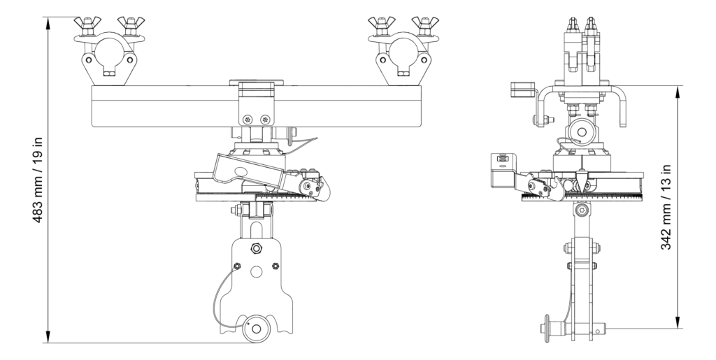CLAMP1000-BASEとCLAMP1000-DUALマウントアダプターを組み合わせることで、トラスの二弦に均等に荷重を分散できます。中心間距離が200mm~500mmのトラスに適合します。