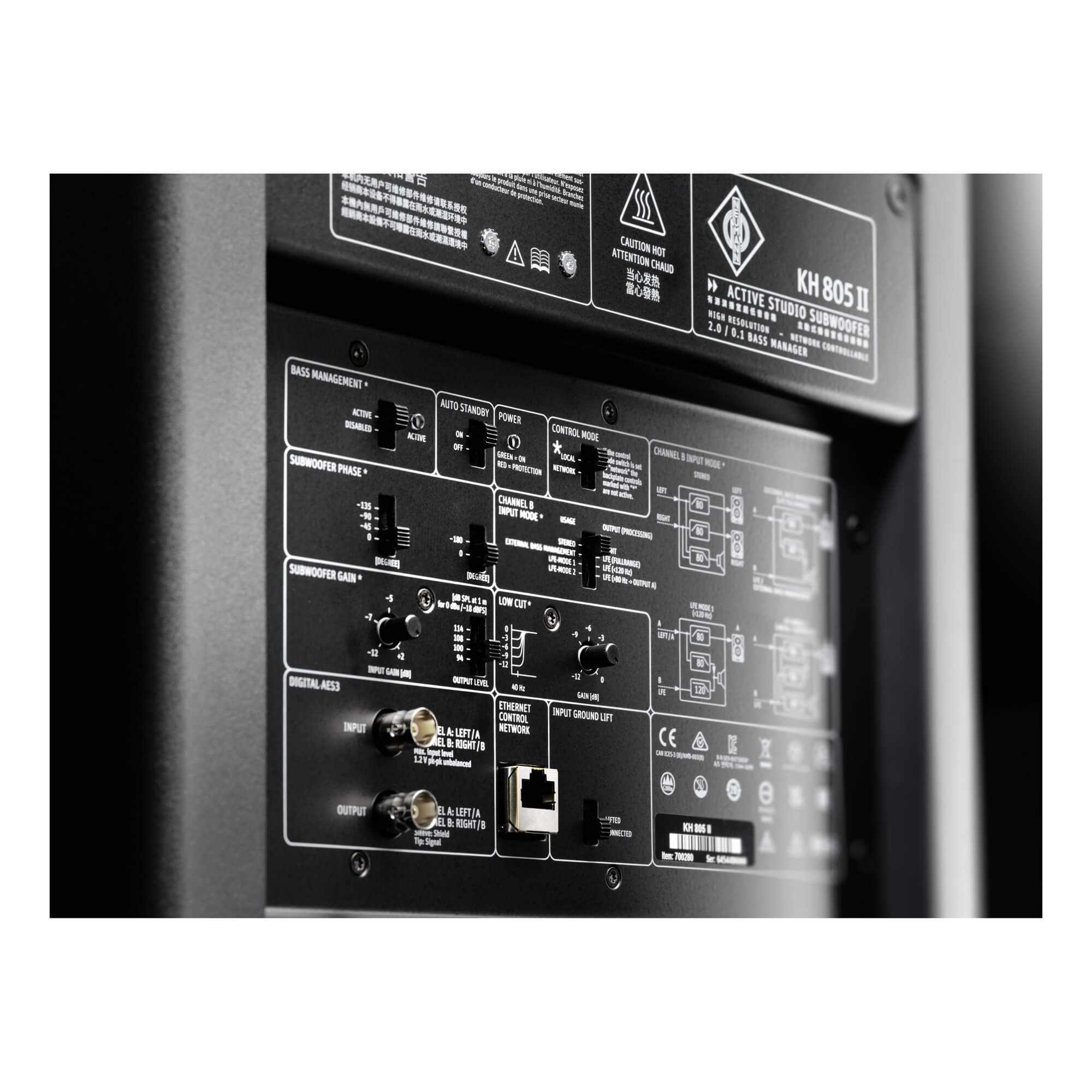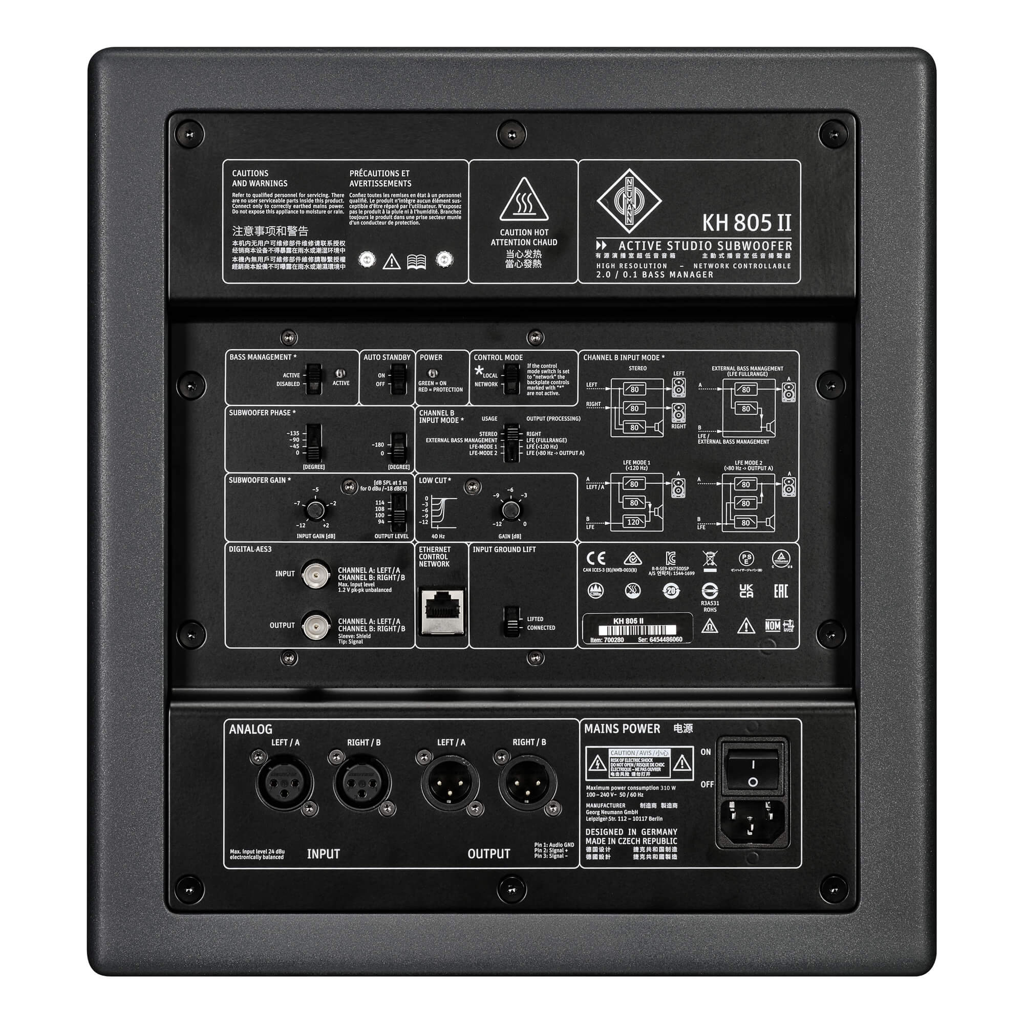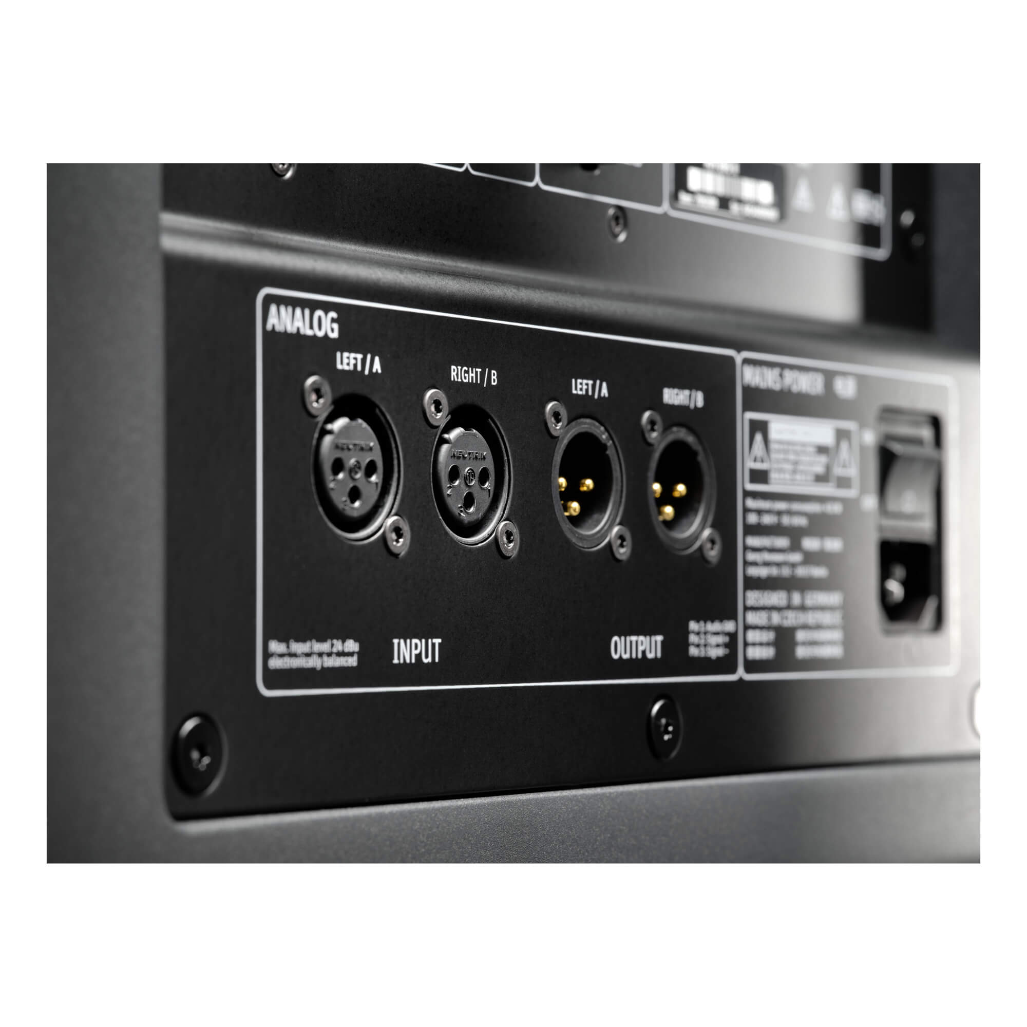 2つのアナログXLRインプットは、2 つのアナログXLRアウトプットと同様に電子バランスに対応しています。最大 192kHz / 24ビットデジタル入力 (BNC) は、AES3および S/P-DIF信号の両方に対応します。サブウーファーにはオートスタンバイ機能がありますが、バックプレートスイッチで解除することができます。