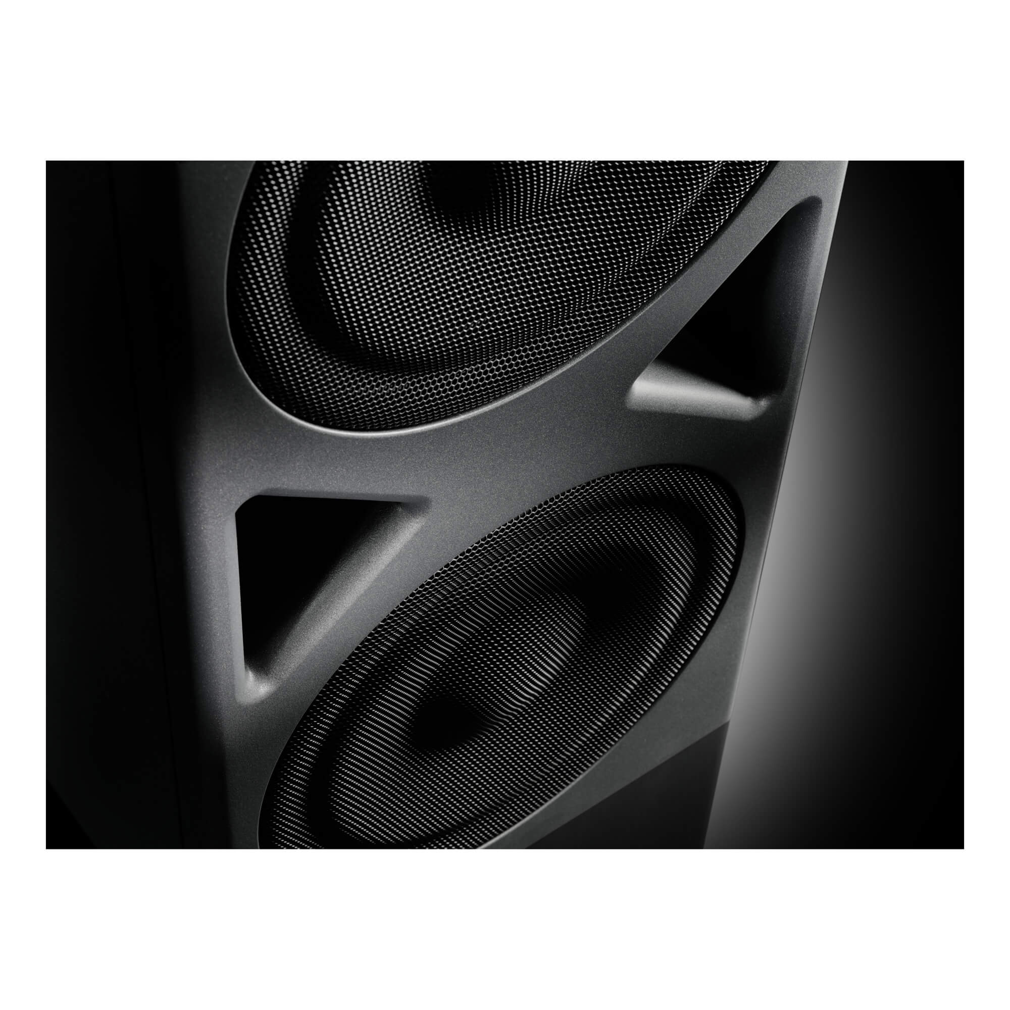 サブウーファーは通常床に設置されるため、頑丈なグリルがドライバーを偶発的な損傷から保護します。堅牢なキャビネットは、非常に効率的なバスレフ型システムを特徴とし、ポートノイズが聴き取れない最も厳密な低音再生のために慎重に設計およびチューニングされています。