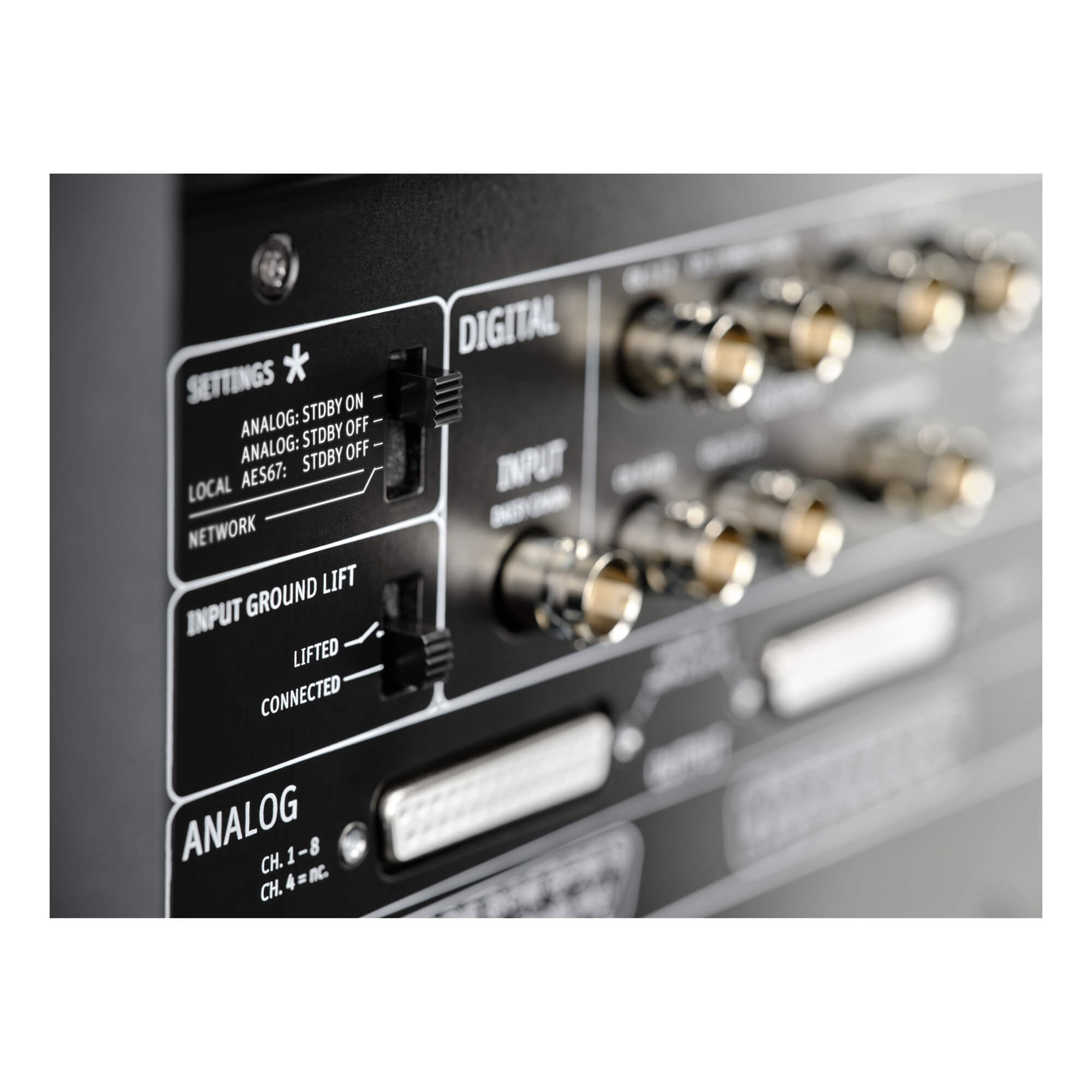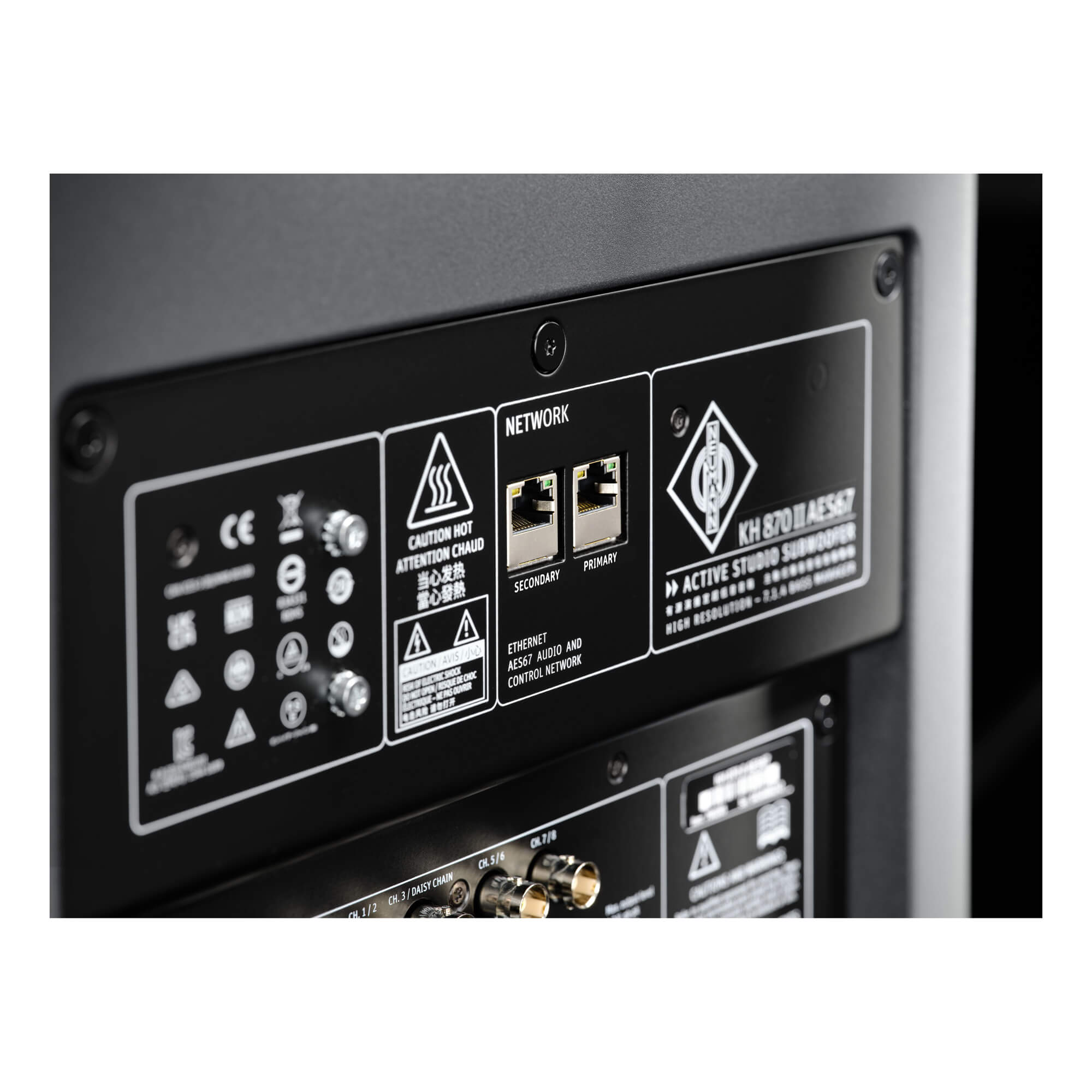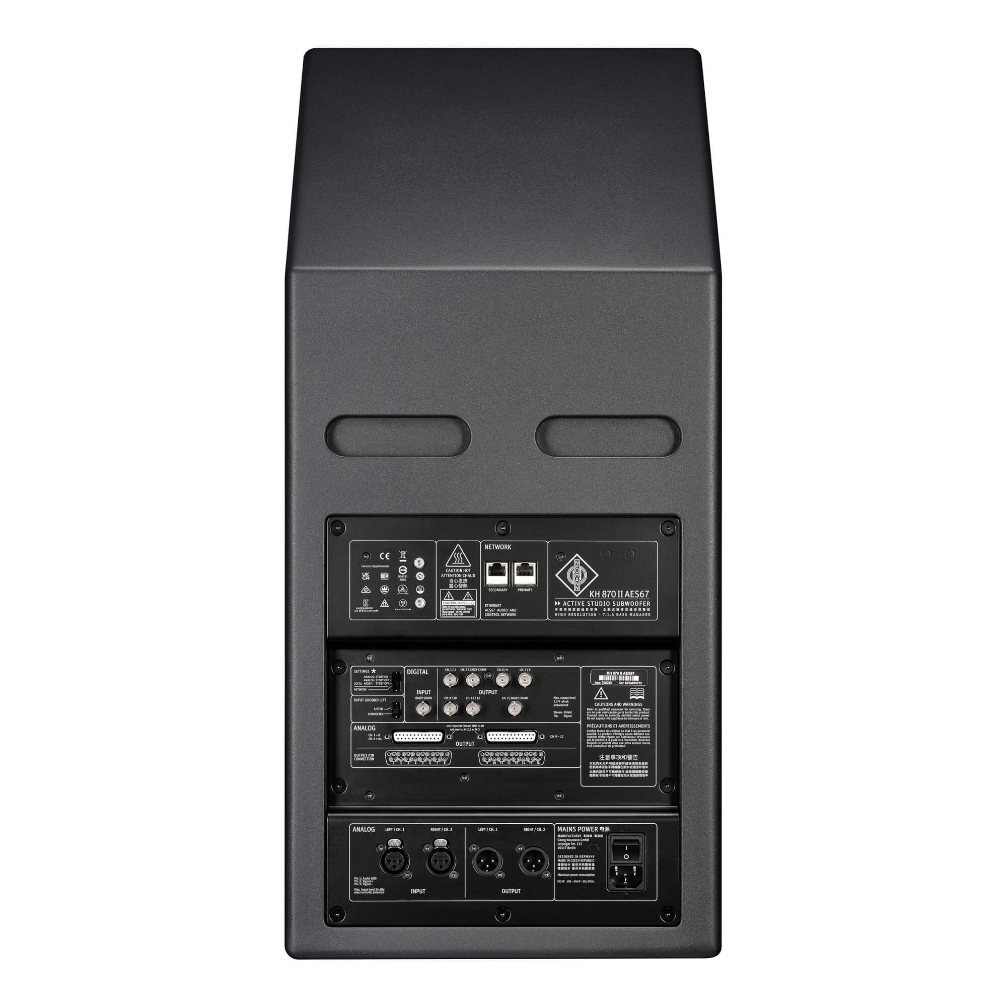 ステレオ用に、2つのアナログXLRインプットおよびアウトプットがサブウーファーへ接続できます。KH 810 II AES67は、マルチチャンネル用にアナログ接続用の2つのD-Sub 25ピンコネクタと、11台のスタジオモニターへのデジタル接続用の7つのAES3 出力 (BNC) を提供します。すべての入力と出力は電子バランスに対応しています。AES3 出力 (BNC) は、BNCからRCAケーブルを使用する ノイマンスタジオモニターのS/P-DIF入力と互換性があります。