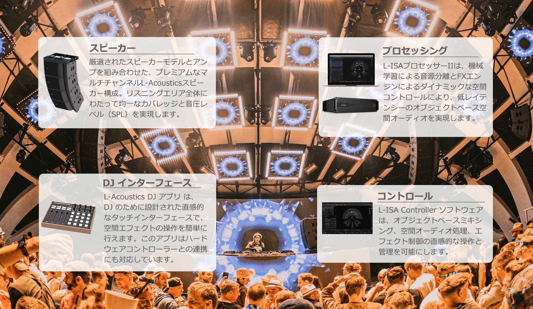 業界をリードするL-ISAプロセッシングテクノロジーを搭載したL-Acousticsエコシステムの精度とパフォーマンスを体感してください。この統合により、比類のない空間オーディオコントロールと明瞭な音像を実現します。